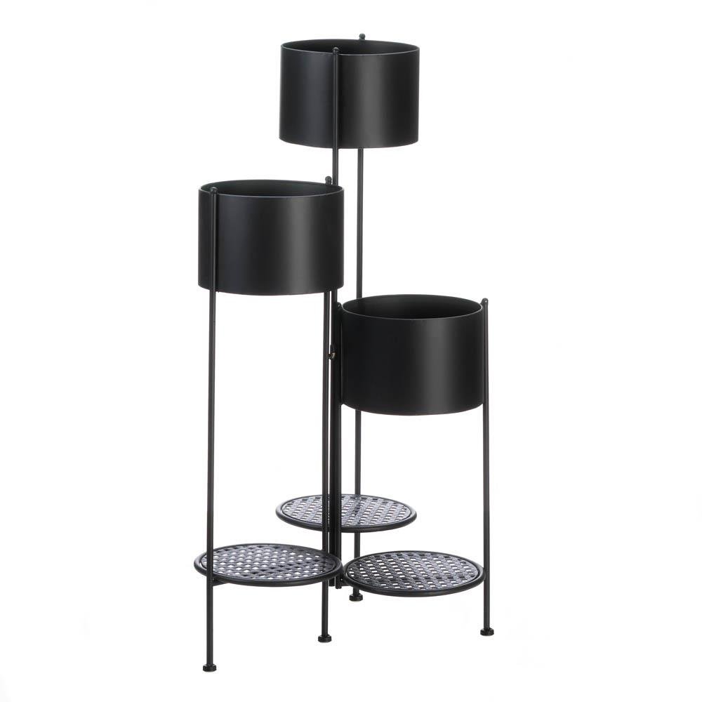 • Showcase your plants with this contemporary matte black finish 3-tier plant stand. The graceful stair step arrangement can display 3 large plants in a minimum amount of space. Additionally, 3 smaller plants can be placed on the bottom metal mesh shelves.