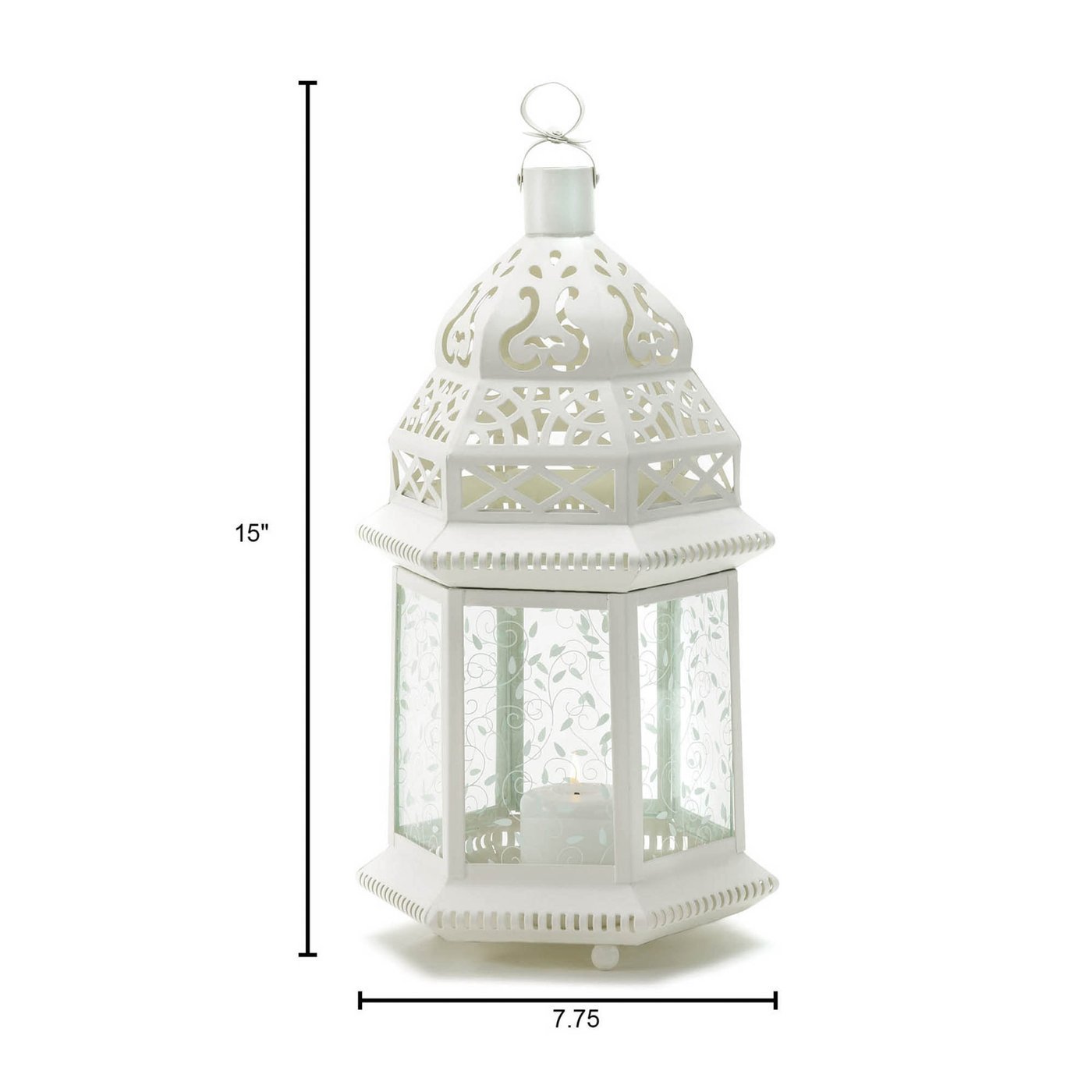 • Made from durable iron and glass with decorative cutouts to enhance the candle's flickering light.